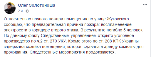 "Относительно ночного пожара помещения по улице Жуковского сообщаю, что предварительная причина пожара: воспламенение электросети в коридоре второго этажа. В результате погибло 5 человек. По данному факту следственным управлением открыто уголовное производство по ч.2 ст.270 Уголовного кодекса Украины (нарушение установленных законодательством требований пожарной безопасности – прим.ред)", - написал Золотоноша на своей странице в соцсети Facebook в понедельник.