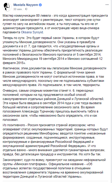 "Это будет первый закон Украины, в котором будут упомянуты Минские договоренности... Фактически, этим документом мы легализуем Минские договоренности в рамках правового поля Украины. С формальной точки зрения Минские договоренности не могут считаться источником права, в том числе международного, поскольку они не подписывались субъектами международного права. Их подписывали, в том числе, террористы", - написал Найем.