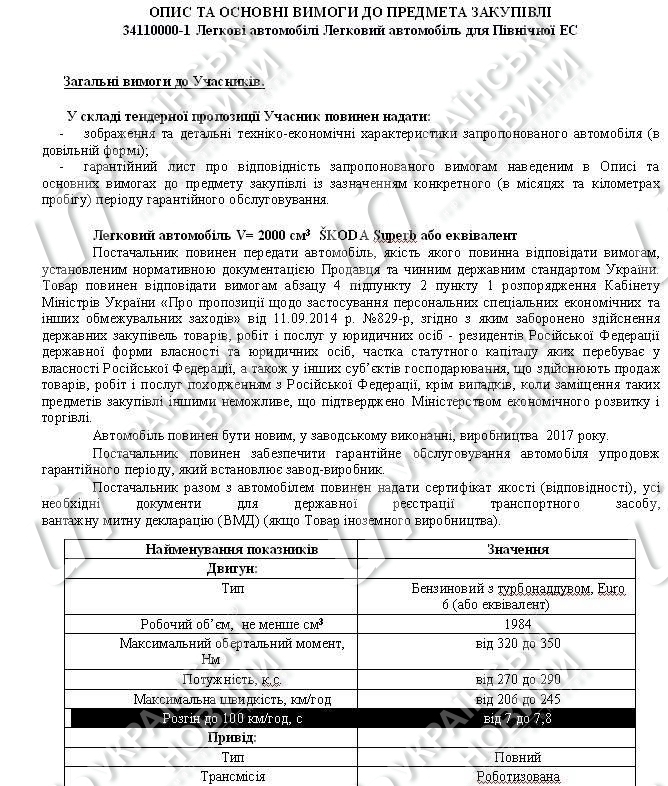В частности, речь идет о легковом автомобиле Skoda Superb или эквиваленте со скоростью разгона не ниже 7,8 сек до 100 км/ч. Автомобиль должен быть новым и 2017 года выпуска.
