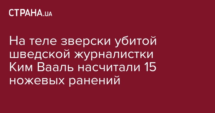 Подозреваемый в убийстве шведской журналистки Ким Валль изобретатель Петер Мэдсен будет задержан еще на четыре недели после того, как на суде в Копенгагене было заявлено, что на ее теле обнаружены 15 ножевых ранений, передает The Guardian.