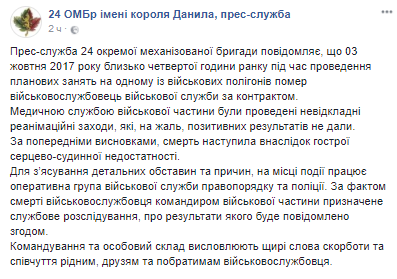 По словам начальника пресс-службы 24-й ОМБ Владимира Фитьо, для выяснения подробных обстоятельств и причин, на месте происшествия работает оперативная группа военной службы правопорядка и полиции. По факту смерти военнослужащего командиром воинской части назначено служебное расследование.