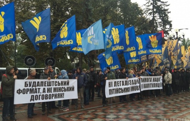 В частности у них плакаты "Будапештский формат, а не минский договорняк", "Нет легализации Путинских условий", "Требование нации - нет капитуляции".