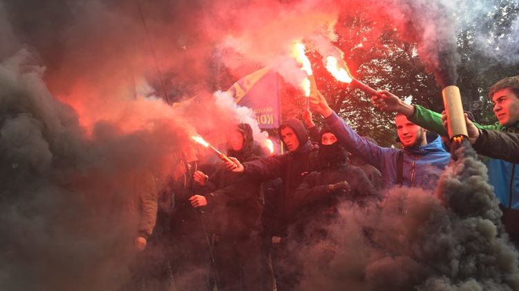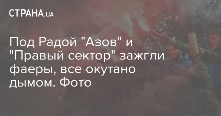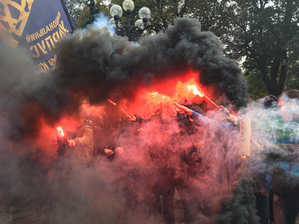 Под Радой "Азов" и "Правый сектор" зажгли фаеры, все окутано дымом. Фото