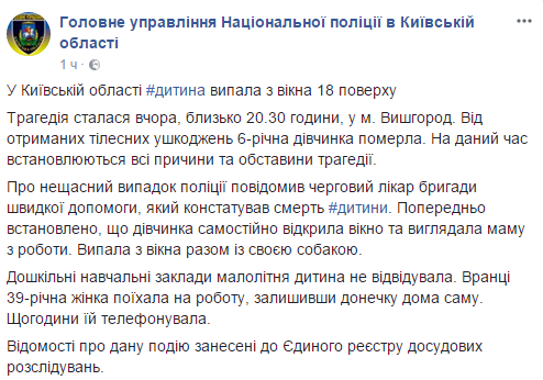 Шестилетняя девочка вместе со своей собакой выпала из окна 18 этажа в Вышгороде, передает Главное управление Национальной полиции в Киевской области в Facebook.