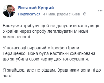Народный депутат Виталий Куприй (внефракционный) сообщил, что он блокирует трибуну "чтобы не допустить капитуляции Украины через попытку легализовать Минские договоренности". Об этом он написал на своей странице Facebook.