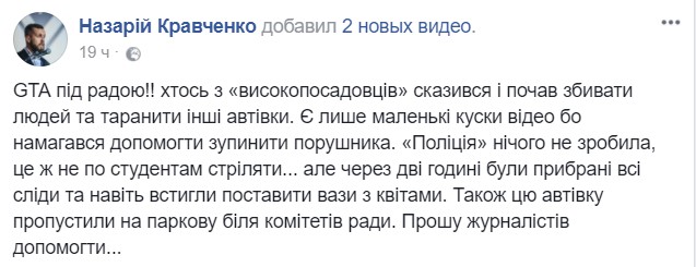 Непосредственными участниками инцидента со "взбесившимся мерсом" стал заместитель главы партии "Национальный Корпус" Назар Кравченко. Он активно пытался помешать злоумышленнику покинуть правительственный квартал, не гнушаясь методами.