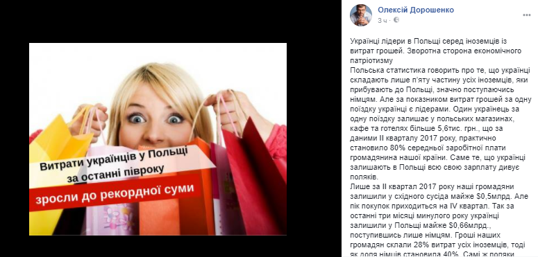 "Один украинец за одну поездку оставляет в польских магазинах, кафе и гостиницах более 5600 грн, что по данным II квартала 2017 года, практически составляло 80% средней заработной платы гражданина нашей страны. Именно то, что украинцы оставляют в Польше всю свою зарплату, удивляет поляков", - написал Дорошенко.