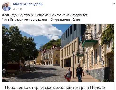 В Сети уже опасаются за работоспособность театра. Блогер Максим Гольдарб уже отреагировал на открытие театра постом с намеком на то, что на объектах, которые в последнее время открывал Порошенко, случались ЧП: "Жаль здание, теперь непременно сгорит или взорвется. Хоть бы люди не пострадали ...Открыватель, блин".