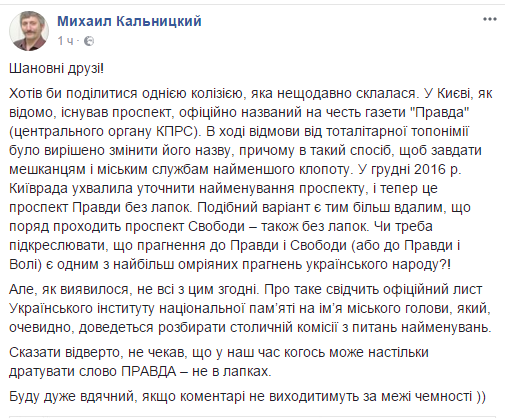 Кальницкий разъясняет, что ранее в столице Украины действительно существовал проспект, официально названный в честь газеты "Правда" (центрального органа КПСС). В ходе отказа от тоталитарной топонимии было решено изменить его название, причем таким образом, чтобы нанести жителям и городским службам малейшего хлопот.