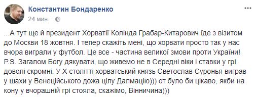 "... А тут еще и президент Хорватии Колинда Грабарь-Китарович едет с визитом в Москву 18 октября. И теперь скажите мне, что хорваты просто так у нас вчера выиграли в футбол. Это все - часть большого заговора против Украины!"