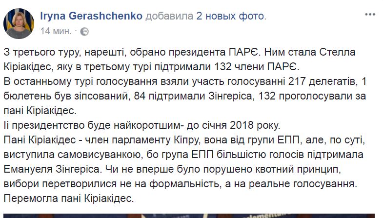 "С третьего тура избран президент ПАСЕ. Им стала Стелла Кириакидес, которую в третьем туре поддержали 132 членов ПАСЕ. Приняли участие в голосовании 217, 1 бюллетень испорчен, 84 поддержали Зингериса, 132 за Кириакидес. Ее президентство будет до января 2018 года. Она от группы ЭПП, но, по сути, выступила самовыдвиженкой, потому группа ЭПП большинством голосов поддержала Эмануэля Зингериса. Но был нарушен квотный принцип, выборы превратились не в формальность, а на реальное голосования", - написала Геращенко.