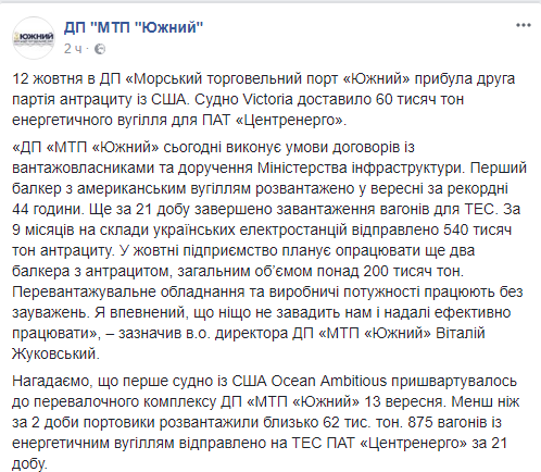 Всего судно "Victoria" доставило в Украину 60 тысяч тонн энергетического угля из США для ПАО "Центрэнерго".