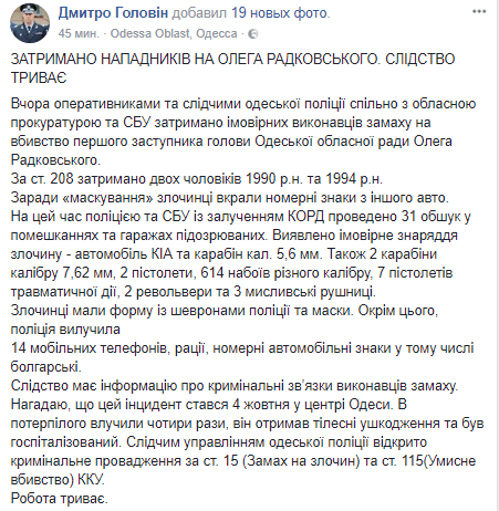 Правоохранители 12 октября задержали двух человек, которые подозреваются в совершении покушения на заместителя главы Одесского облсовета Олега Радковского.