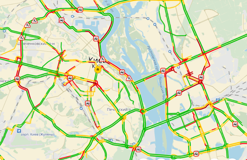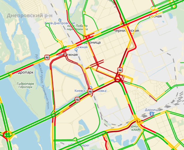 На Левобережье пробка из-за ДТП образовалась на проспекте Соборности. Также движение затруднено на проспекте Мира и в районе Дарницкой площади.