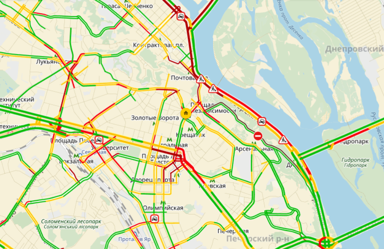 Заторы также образовались на Набережном шоссе и Набережно-Крещатицкой улице.