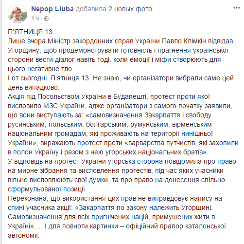 "Уверена, что использование этих прав не оправдывает надписи на спине участника акции "Закарпатье по закону принадлежит Венгрии. Самоопределение для всех угнетенных наций, принужденных жить в Украине"... И для полноты картинки - официальный флаг каталонской автономии", - сообщила Непоп.