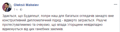 "Решительно будем протестовать и ожидаем, что власти Венгрии безотлагательно отмежуются от этих позорных призывов", - отметил Макеев.