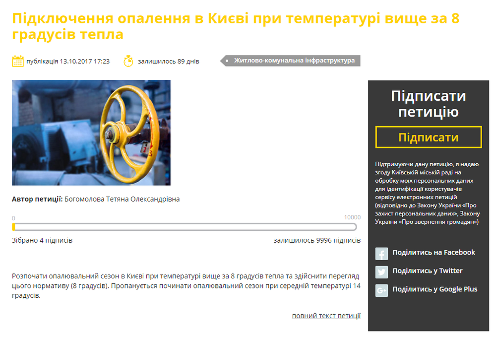 13 октября на сайте Киевсовета появилась петиция с требованием включить отопление в жилых домах при среднесуточной температуре выше +8 градусов. Об этом сообщается на сайте петиций Киевсовета.