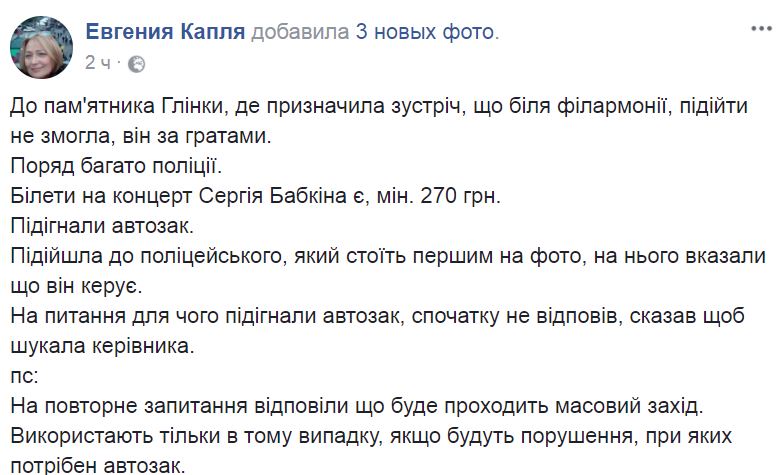 "К памятнику Глинки, где назначила встречу, что у филармонии, подойти не смогла, он за решеткой. Рядом много полиции. Билеты на концерт Сергея Бабкина есть, мин. 270 грн. Подогнали автозак", - написала активистка.