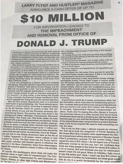 Объявление об этом было опубликовано в газете Washington Post. "Ларри Флинт и журнал Hustler объявляют о предложении до $ 10 млн за информацию, которая приведет к импичменту и смещение с поста Дональда Трампа", - говорится в  тексте.