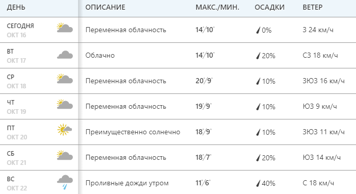 Сайт Weather.com пишет, что в понедельник-вторник ожидается температура +14 днем. Со среды потеплеет до +18...+20.