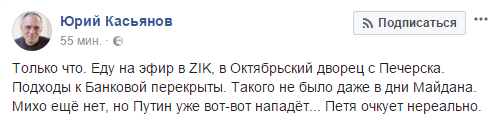 Ту же информацию подтверждает и Юрий Касьянов. "Подходы к Банковой перекрыты. Такого не было даже в дни Майдана. Михо ещё нет, но Путин уже вот-вот нападёт... Петя очкует нереально",  - написал он.