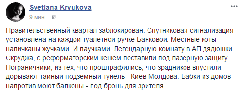 А заместитель главного редактора "Страны" Светлана Крюкова  описала ситуацию в центре Киева с юмором. "Правительственный квартал заблокирован. Спутниковая сигнализация установлена на каждой туалетной ручке Банковой. Местные коты напичканы жучками. И паучками. Легендарную комнату в АП дядюшки Скруджа, с реформаторским кешем поставили под лазерную защиту. Пограничники, из тех, что проштрафились, что зрадников впустили, дорывают тайный подземный тунель - Киёв-Молдова. Бабки из домов напротив моют балконы - под бронь для зрителя..."- написала она.