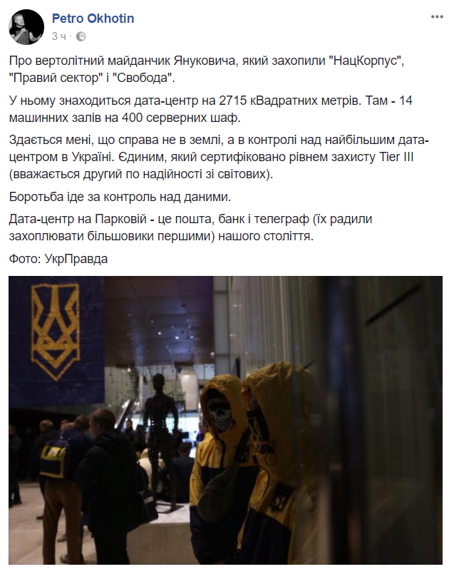 "В нем находится дата-центр на 2715 квадратных метров. Там - 14 машинных залов на 400 серверных шкафов. Кажется мне, что дело не в земле, а в контроле над крупнейшим дата-центром в Украине. Единственным, который сертифицирован уровнем защиты Tier III (считается вторым по надежности из мировых). Борьба идет за контроль над данными", - утверждает Петр Охотин.