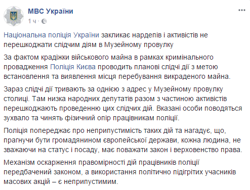 "Ряд народных депутатов вместе с частью активистов препятствовали проведению этих следственных действий. Указанные лица вели себя вызывающе и оказывали физическое сопротивление работникам полиции", - говорится в сообщении МВД в Facebook.