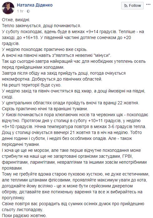 "В субботу похолодает, днем будет в пределах + 9 + 14 градусов. Теплее - на западе, до + 16 + 18. В южной части дотянет солнышком до +20 градусов. В воскресенье похолодает практически уже везде", - пишет она в Facebook.