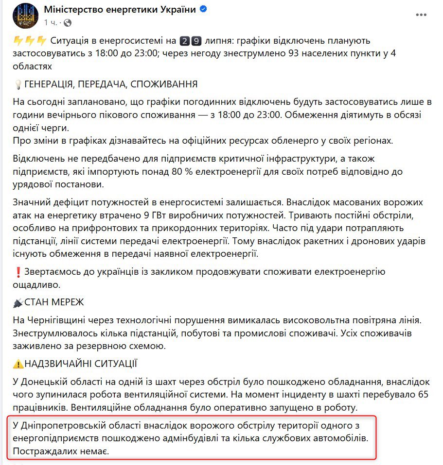 "В результате вражеского обстрела территории одного из энергопредприятий повреждены админздания и несколько служебных автомобилей. Пострадавших нет", - сообщается в утренней сводке Минэнерго.