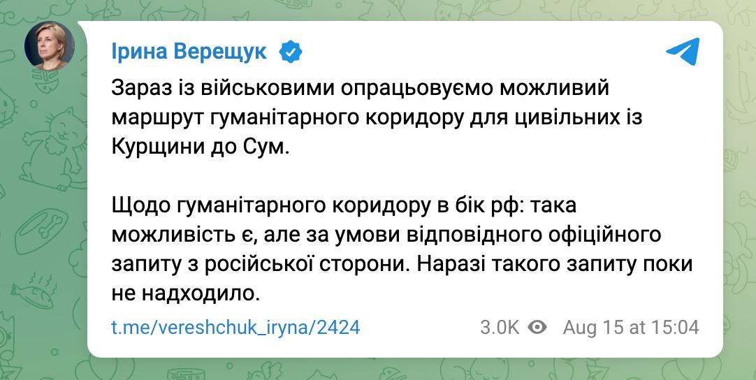 "Относительно гуманитарного коридора в сторону России: такая возможность есть, но при условии соответствующего официального запроса с российской стороны. Пока такого запроса пока не поступало", - пишет она.