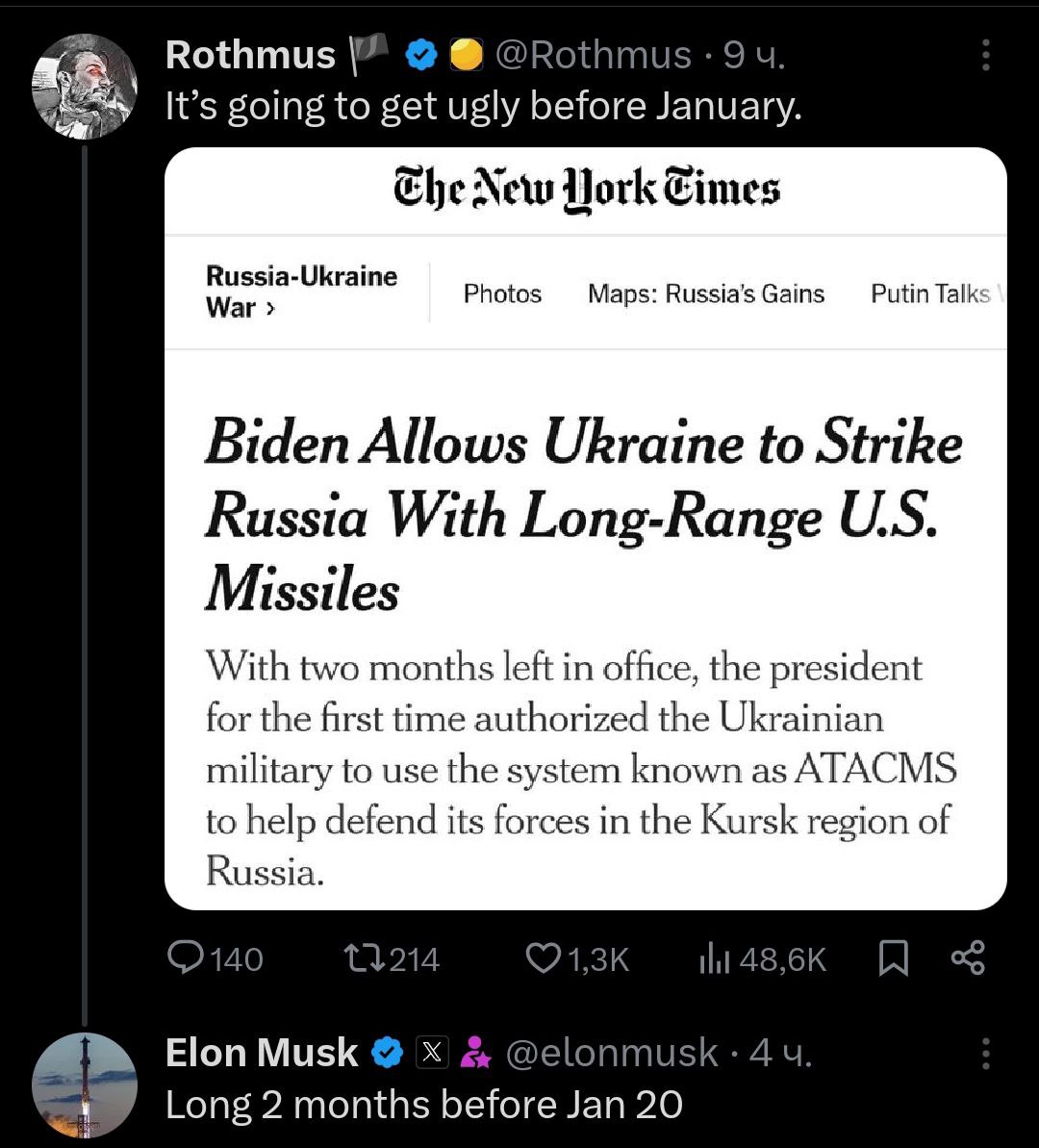 8.28 Новая порция критических комментариев Илона Маска по поводу разрешения Байдена бить по России дальнобойными ракетами.