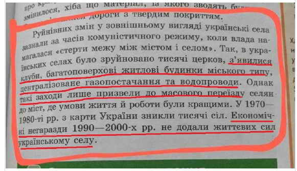 Ещё немного из серии "волшебный мир украинского школьного образования". Оказывается, злые коммунисты, чтобы цинично уничтожить украинское село, подло проводили туда газ и водопровод, чего крестьяне, конечно, не могли пережить и уезжали в города. А лёгкие экономические трудности 90-х и двухтысячных всего лишь не позволили украинским сёлам в должной степени оправиться от этой бесчеловечной практики.