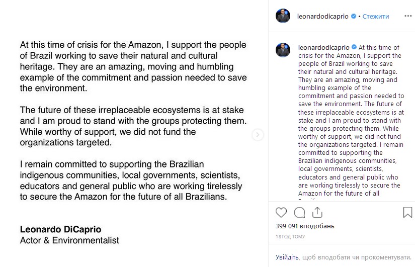 Ди Каприо также уточнил, что продолжает поддерживать все, кто "неустанно работает над обеспечением безопасности Амазонии для будущего всех бразильцев".