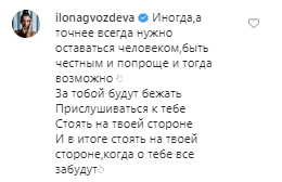 "Иногда,а точнее всегда нужно оставаться человеком, быть честным и попроще и тогда возможно за тобой будут бежать, прислушиваться к тебе, стоять на твоей стороне и в итоге стоять на твоей стороне, когда о тебе все забудут" - написала она.
