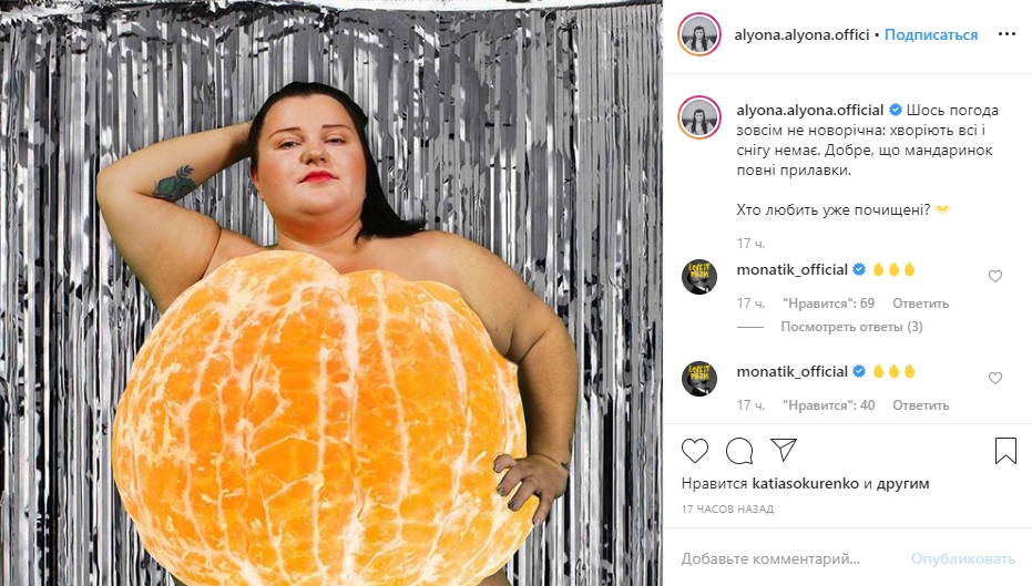 Популярная украинская рэперша Alyona Alyona взорвала соцсети снимком, на котором она позирует обнаженной, прикрывшись мандарином. Откровенное фото певица опубликовала на своей странице в Instagram.