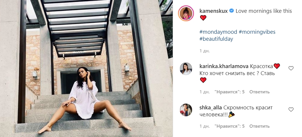 На фото Каменских позирует сидя на лестнице в белоснежной укороченной тунике. В описании публикации певица призналась в любви к утреннему пробуждению. "Love mornings like this", – написала Каменских.
