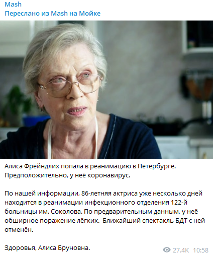 Актриса Алиса Фрейндлих попала в реанимацию с коронавирусом