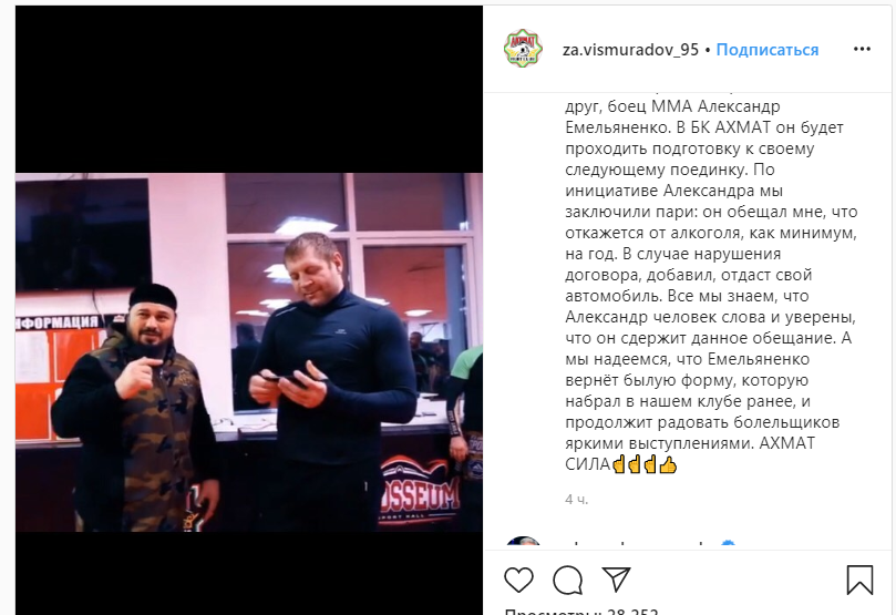 Спортсмен пообещал, что на год бросит пить, об этом заявил руководитель клуба "Ахмат" у себя в Инстаграм.