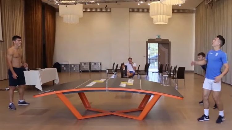 Александр Караваев, Руслан Малиновский, Александр Зинченко и Евгений Коноплянка сыграли партию в текболи. Это некая смесь футбола и настольного тенниса. Пары играют мячом на выгнутом столе по правилам настольного тенниса.