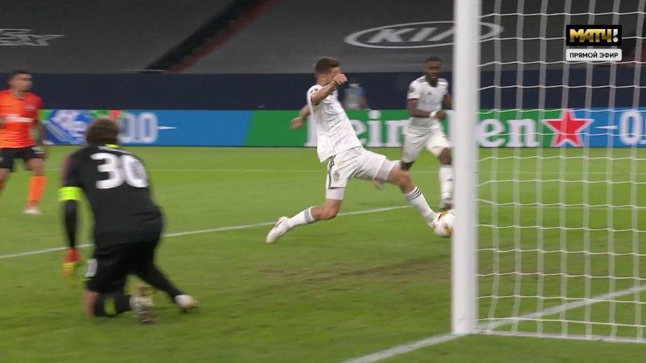 34 Наши с мячом. Передача через всё поле в исполнении Андрея Пятова, где на фланге получают право на штрафной "горняки".