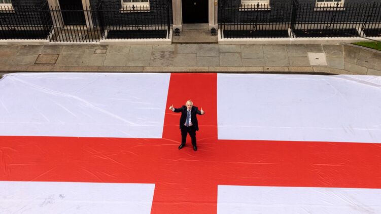 "Давай, Англия", - подписал опубликованное фото Джонсон. На снимке премьер Великобритании стоит на национальном флаге Англии и показывает пальцы вверх.