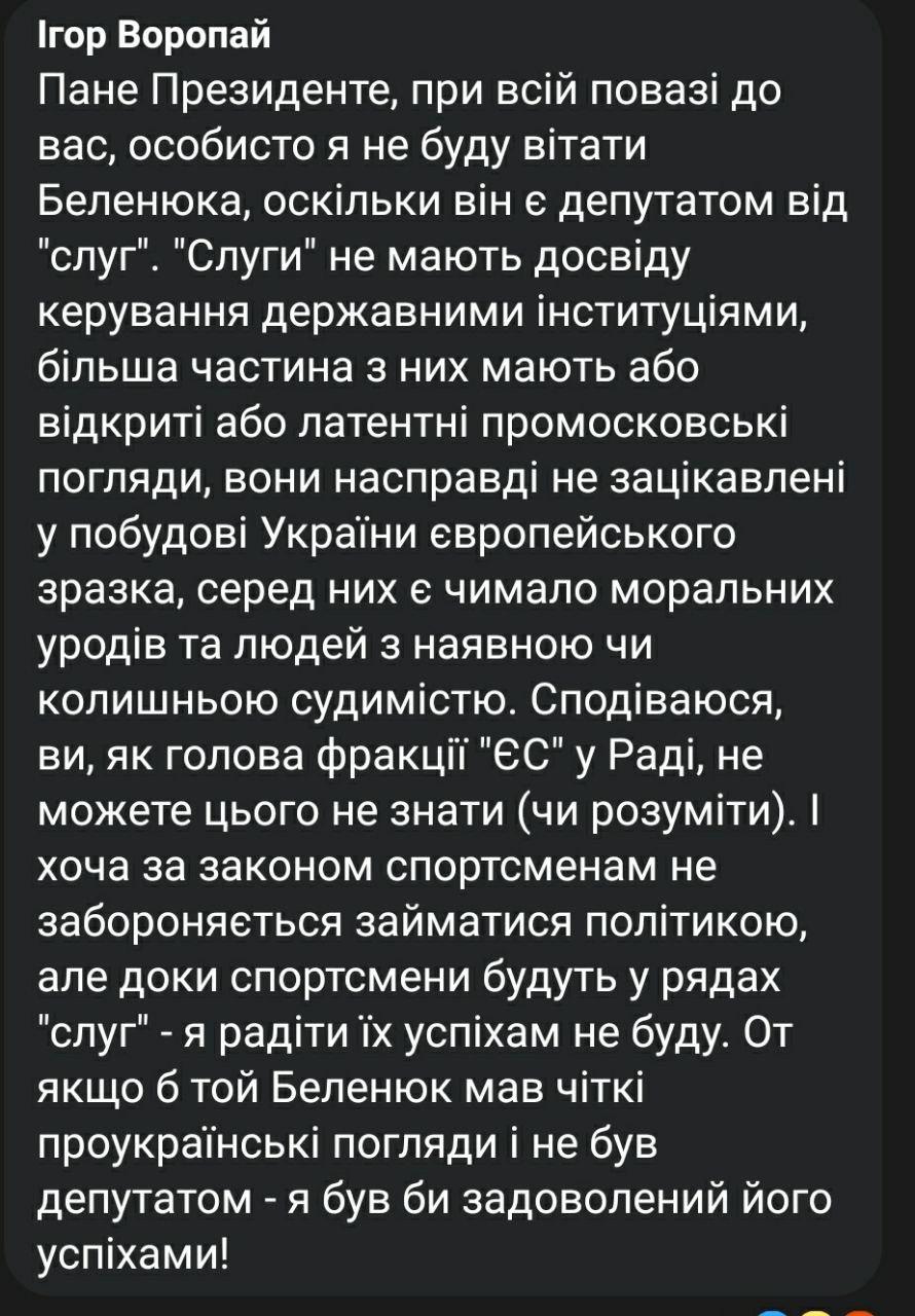 После победы Беленюка на Олимпиаде нашлись те, кто написал, что не рад "золоту", которое он принес, поскольку он депутат "Слуги народа".