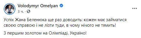 "Успех Жана Беленюк еще раз доказывает: каждый должен заниматься своим делом и не лезть туда, в чем ничего не понимает!" - написал экс-министр Владимир Омелян.
