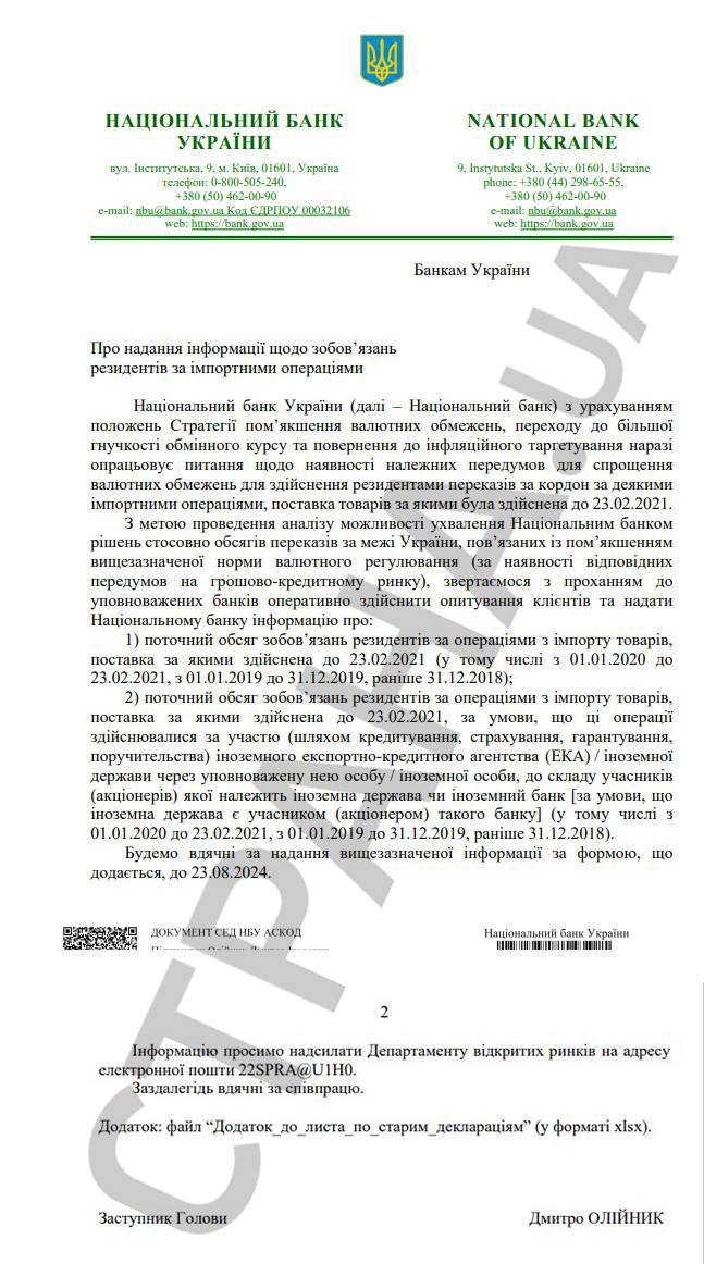 З нього зрозуміло, що НБУ хоче розрахувати суму валюти, яка може піти з України за кордон, якщо влада дозволить бізнесу оплатити старі довоєнні постачання імпортних товарів. Очевидно, ці проплати спочатку застрягли і не були проведені після введення валютних обмежень 24 лютого 2022 року.