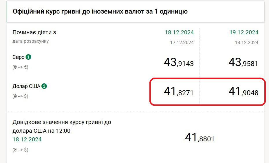 Ціна долара в Україні штурмує нові висоти Сьогодні, 18 грудня, Нацбанк підняв свій офіційний курс у парі гривня/долар з 41,8271 грн/$до 41,9048 грн/$(на 19 грудня).