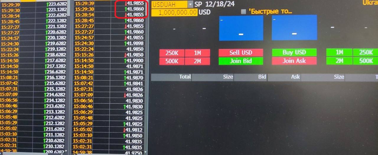 Це сталося за підсумками міжбанківських торгів, які у середу стартували на майданчику Bloomberg з 41,863 грн/$, до полудня досягли 41,95 грн/$та 41,987 грн/$на 15 годин. тобто в півтори копійки від нового психологічного для безготівкового рівня в 42,0 грн/$.