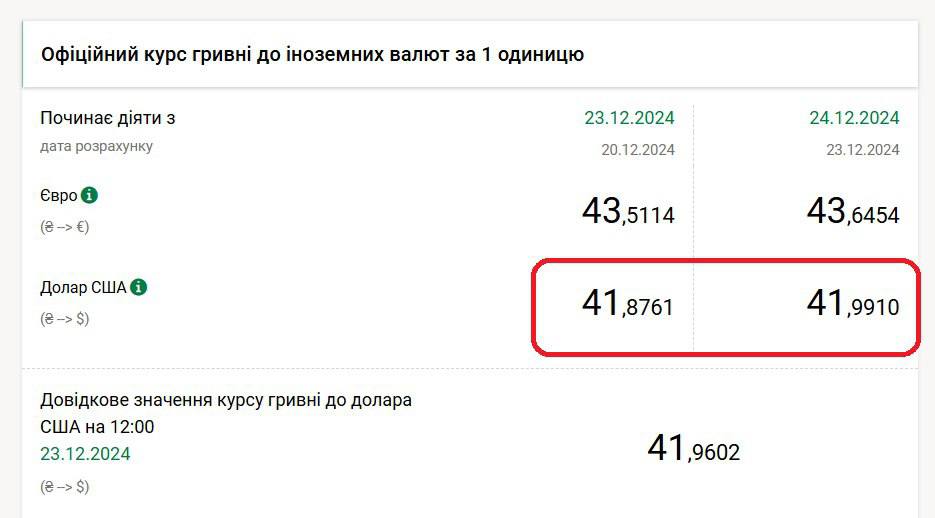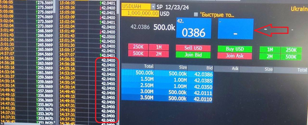 Чим ближче до кінця 2024 року, тим більше дорожчає долар і девальвує гривня. Сьогодні, 23 грудня, торгівля на основному майданчику міжбанку (Bloomberg) стартувала з 41,96 грн/$, але вже до полудня ринок пройшов 42-й психологічний рівень і вийшов на 42,02 грн/$. Вперше у фінансовій історії України. Після обіду більшість угод укладалися по 42,04 грн/$і один раз ненадовго котирування піднімалися до 42,05 грн/$. Але відразу після цього Нацбанк встановив цінник на 42,04 грн/$, і тримав його до закриття торгів, незважаючи на зростаючий валютний попит і проблеми з пропозицією.