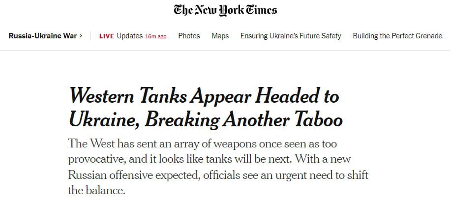 Раніше головком Залужний заявляв, що Україна потребує 300 важких танків західного зразка та близько 600 одиниць іншої бронетехніки. Газета пише, що, можливо, "зараз ми спостерігаємо перший етап виконання зазначеного запиту".